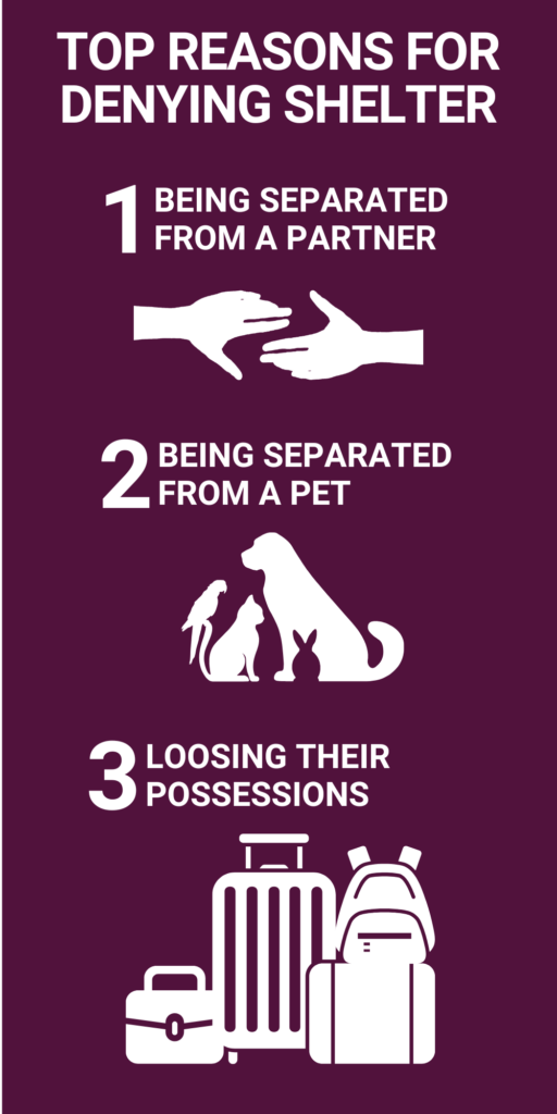 There are many reasons that a person may choose not to go into shelter or shared housing spaces. All of these reasons are valid and none of them mean that person doesn’t want housing or shelter. Let’s address some of the most common reasons for denying or delaying shelter and housing services.