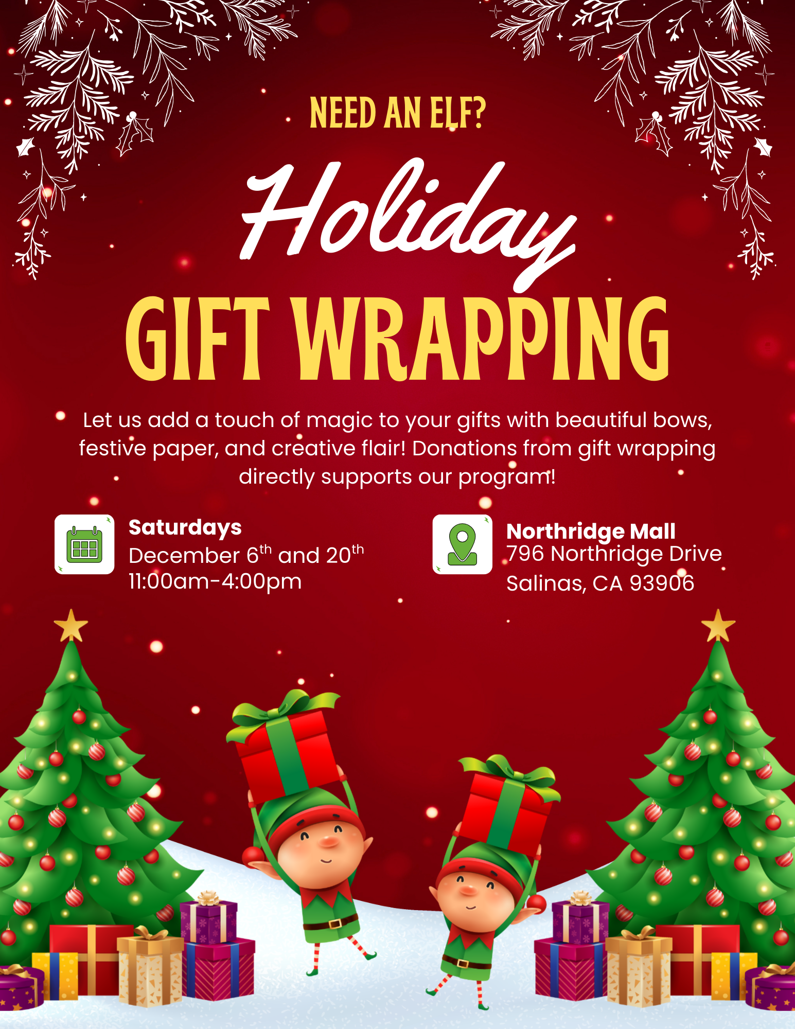 Northridge Mall 796 Northridge Drive, Salinas, CA, United StatesLet us add a touch of magic to your gifts with beautiful bows, festive paper, and creative flair! Donations from gift wrapping directly supports GFW! Date: December 6th & 20th Time: 11 AM - 4 PM Location: Northridge Mall, 796 Northridge Dr., Salinas, CA 93906 Find us near the Cinnabon!